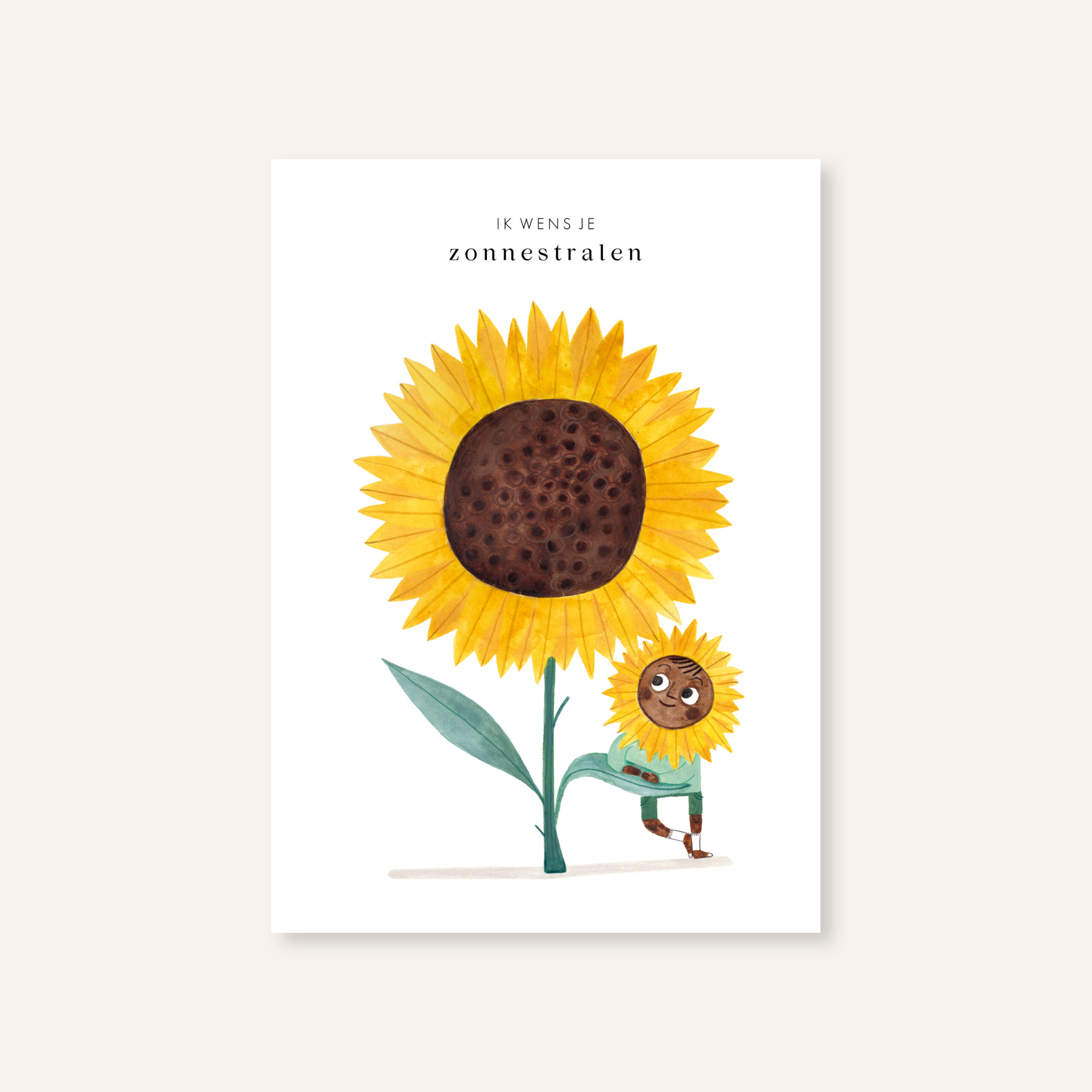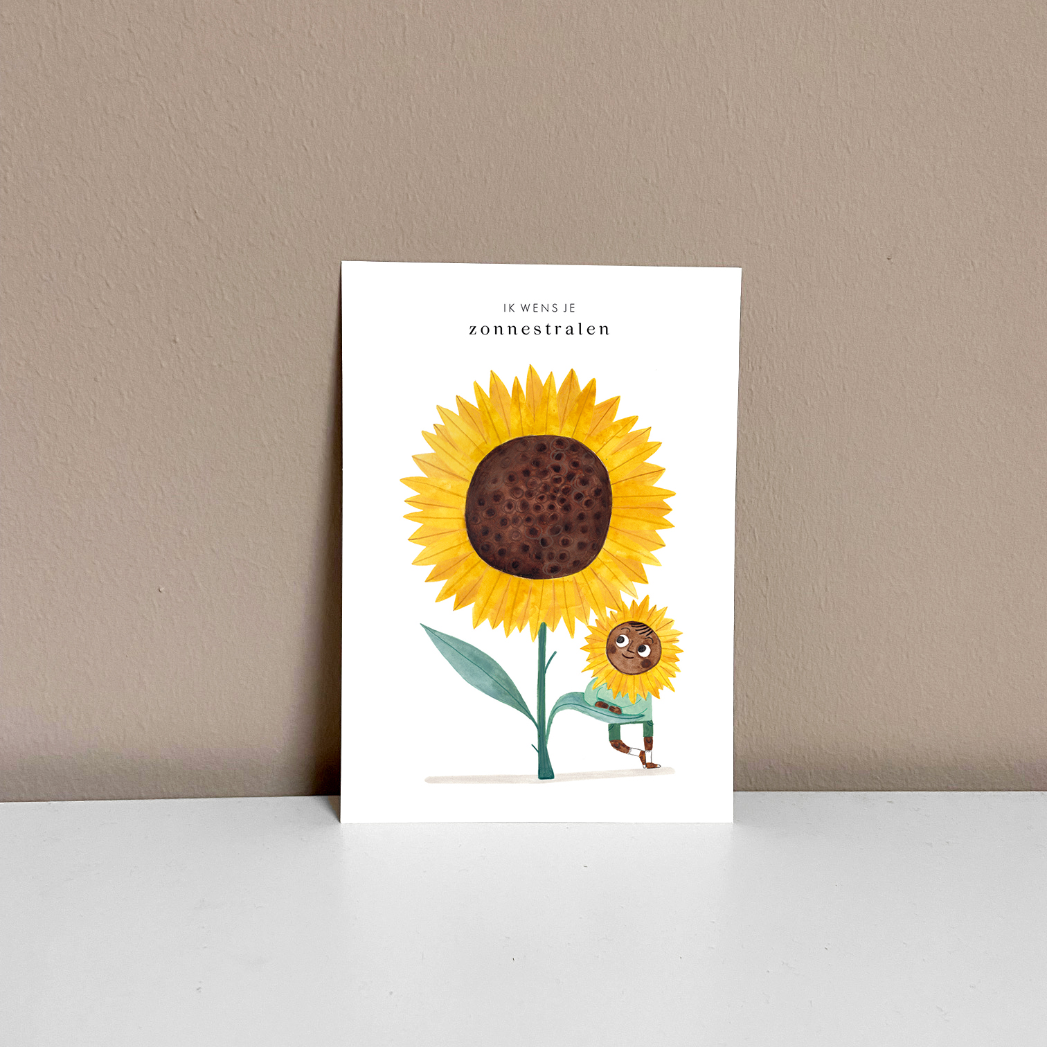 Een vrolijk en opbeurend kaartje voor verschillende gelegenheden. Kaart met een illustratie van een grote zonnebloem en verkleed zonnebloem kindje. De illustratie is oorspronkelijk gemaakt met gouache verf en later digitaal bewerkt. Verstuur je ‘m liever per envelop? Die vind je hier.