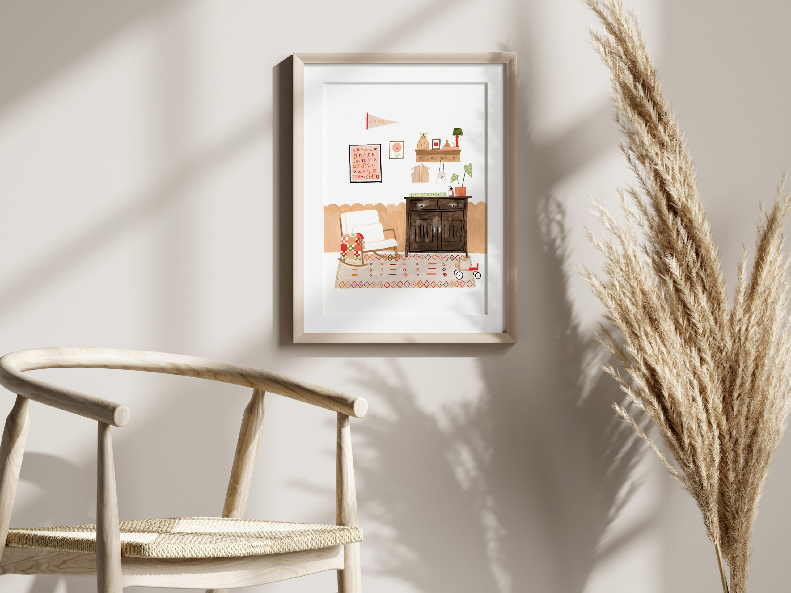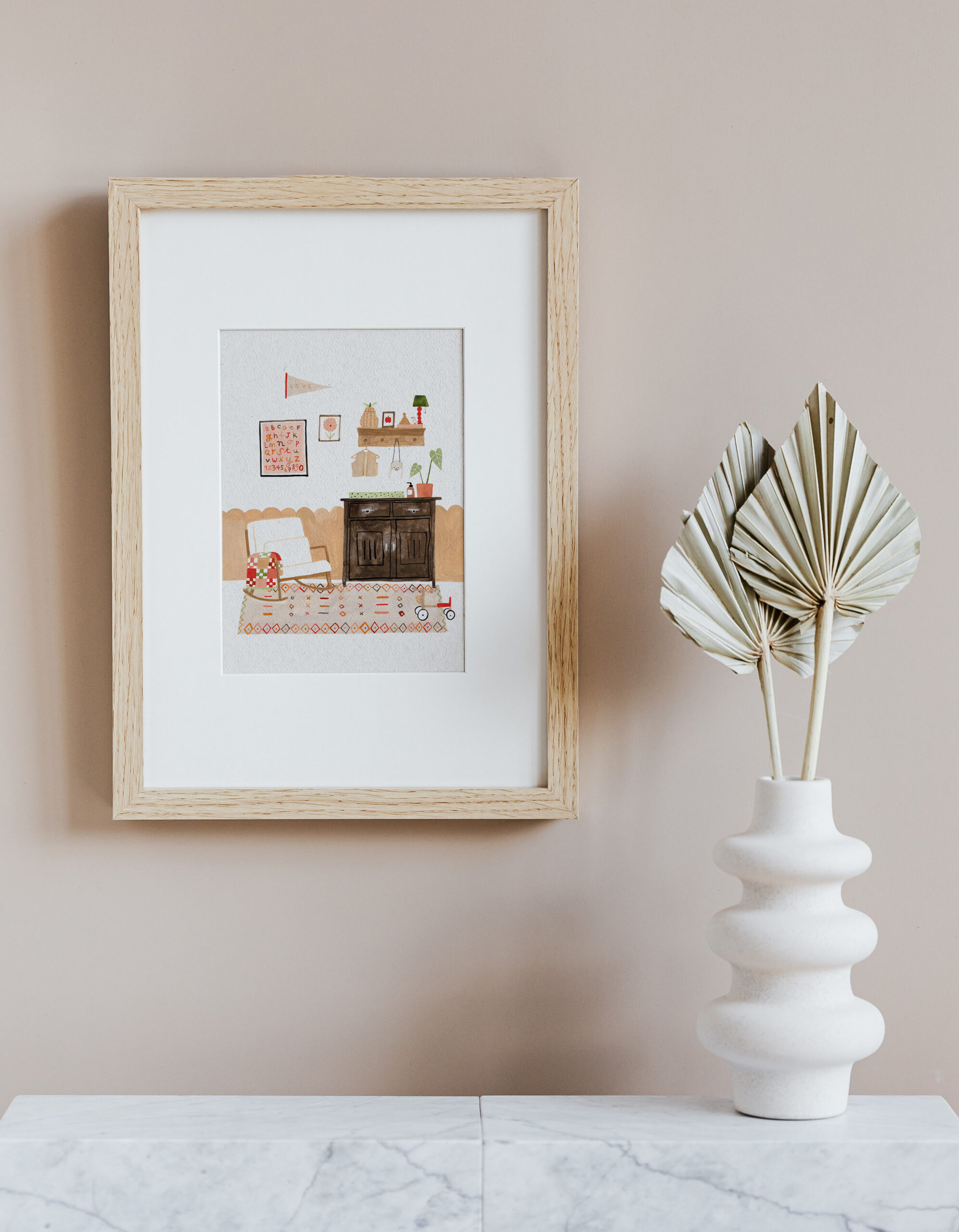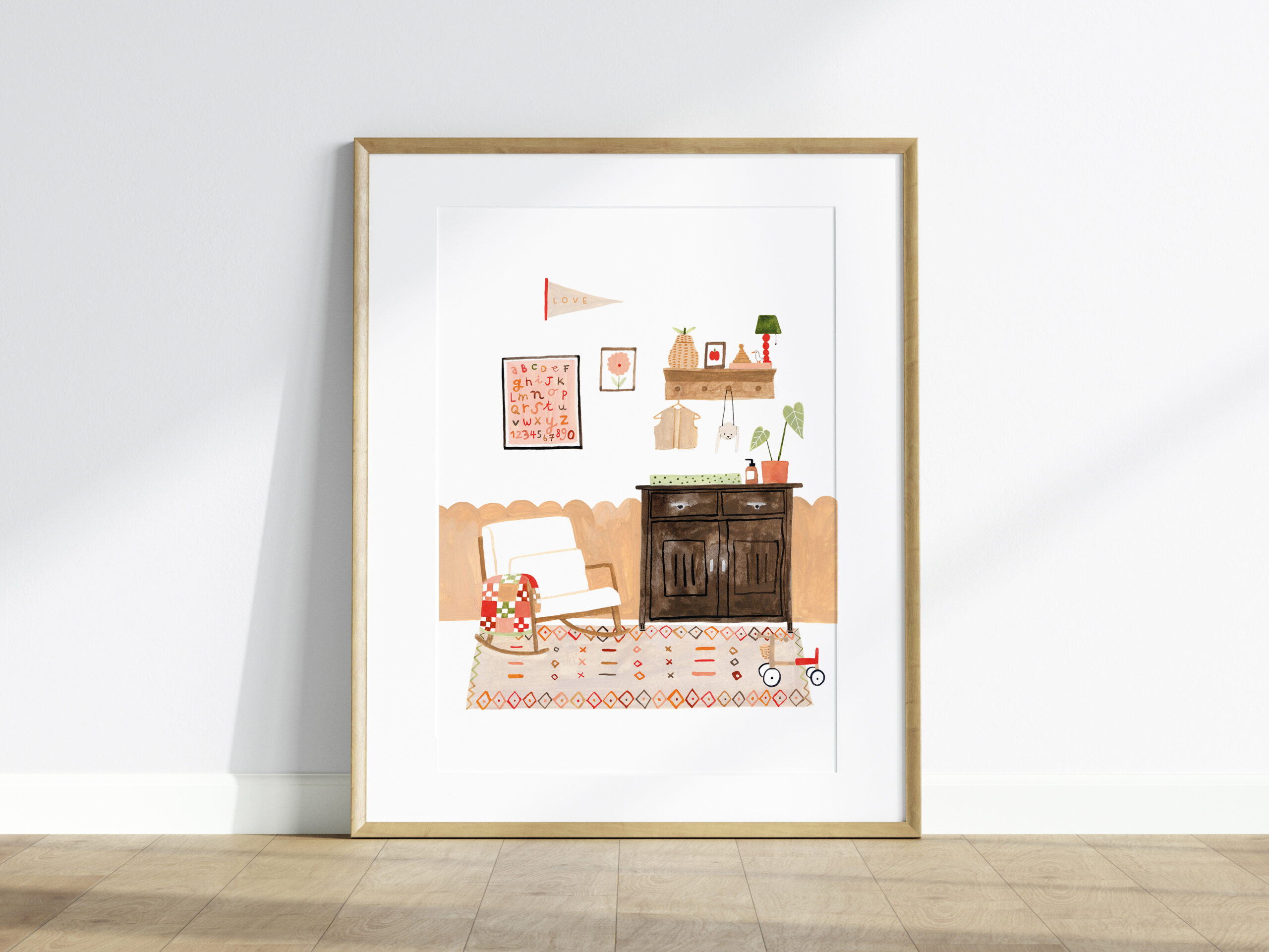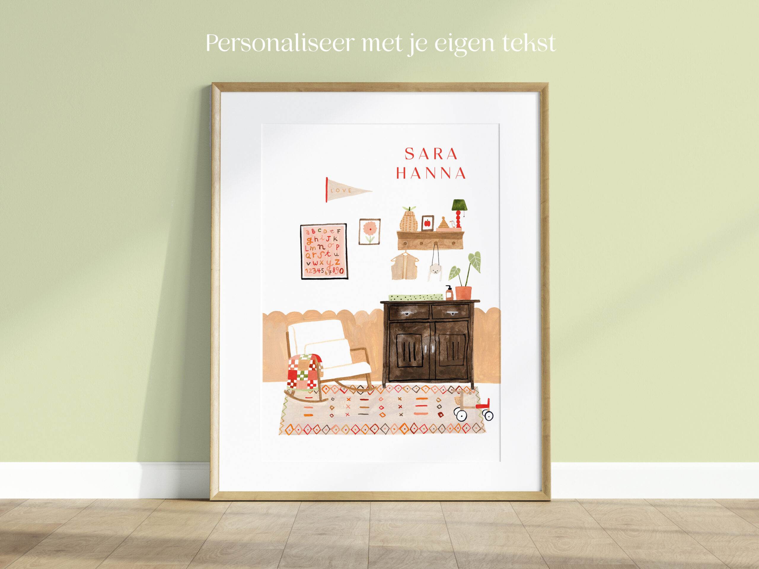 Hoera, er is een kindje geboren. Een vrolijke en neutrale poster met een illustratie van een babykamertje vol lieve babyspulletjes en meubels. Deze poster is leuk om cadeau te geven aan nieuwbakken ouders of hang de poster op in de babykamer. De originele illustratie is handgemaakt met gouache.