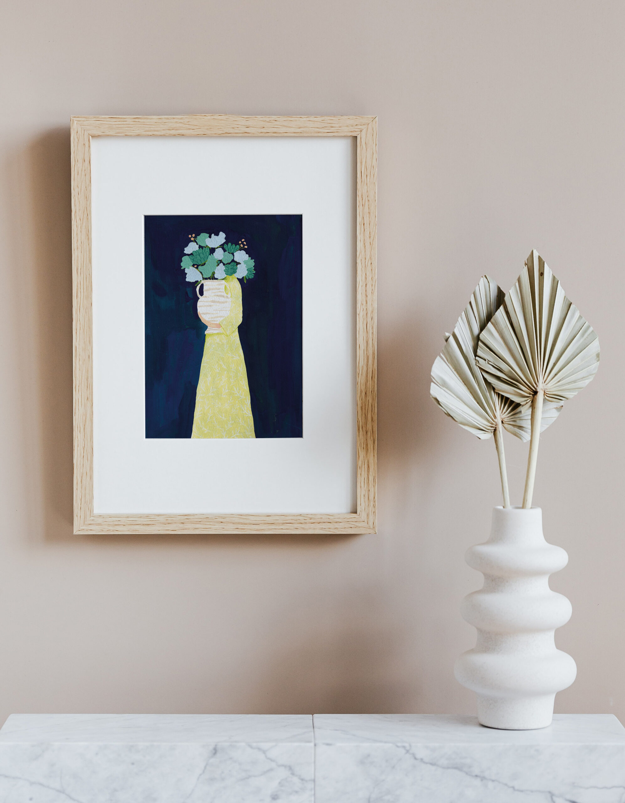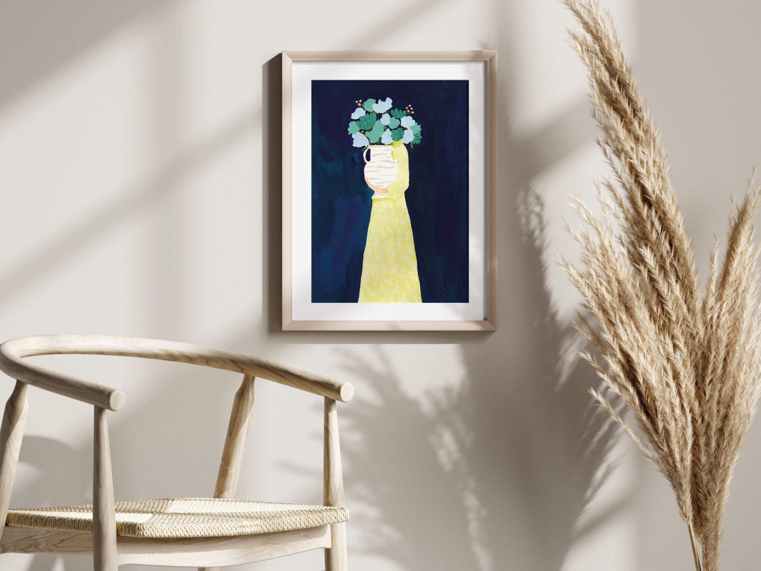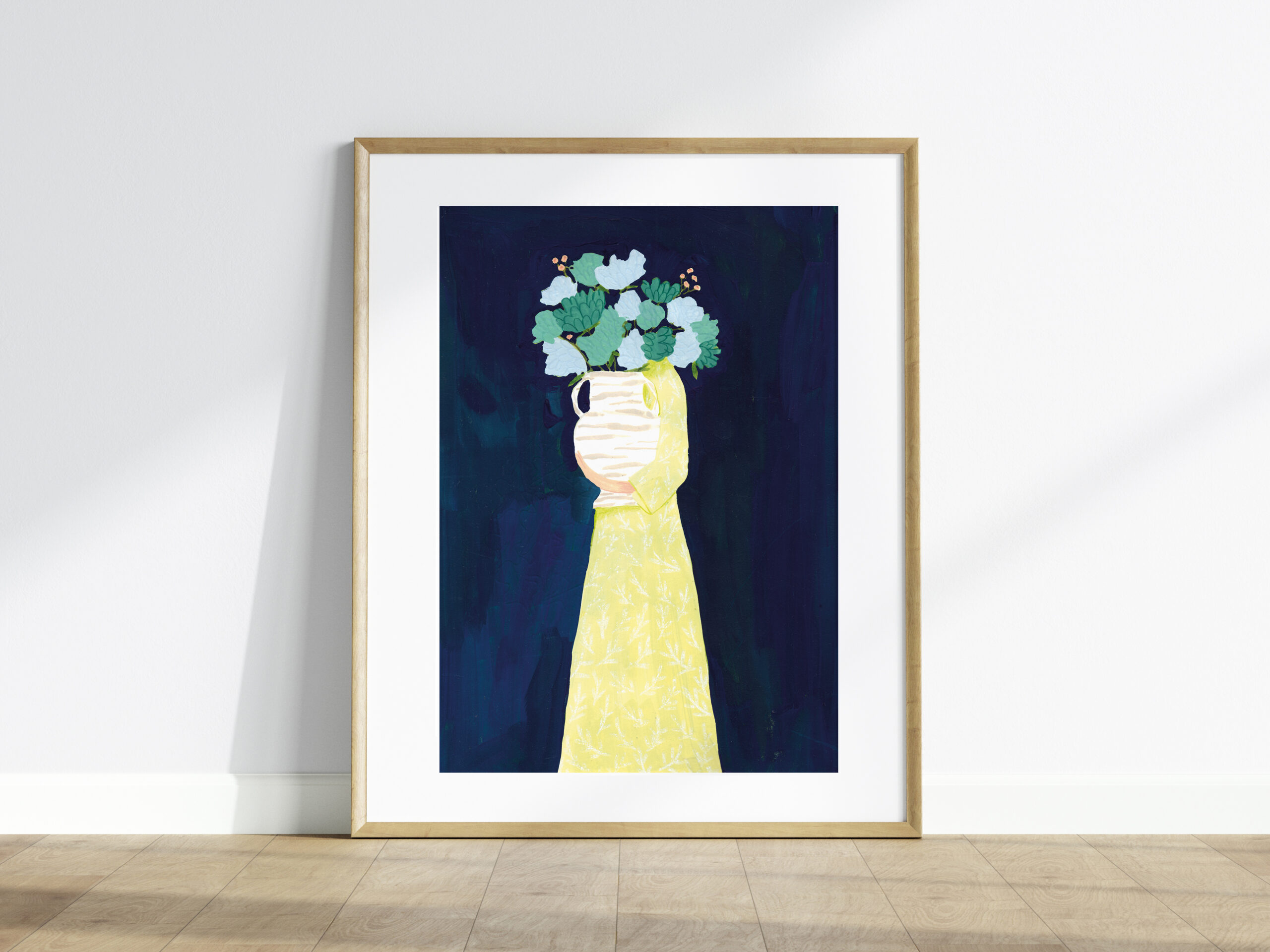 Schilderij van een vrouw met een grote bos bloemen op een donkerblauwe achtergrond. Deze print is met de contrasterende kleuren een prachtige statement piece voor in huis! De originele illustratie is handgemaakt met gouache en kleurpotlood.