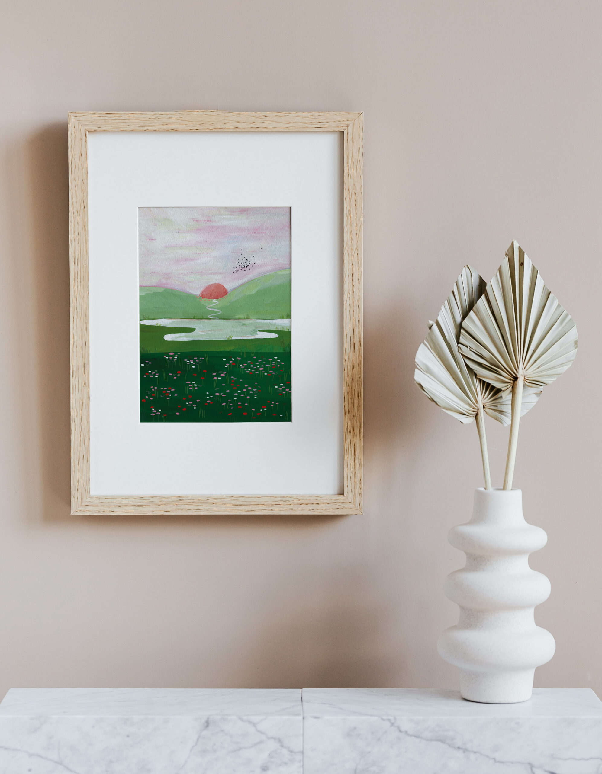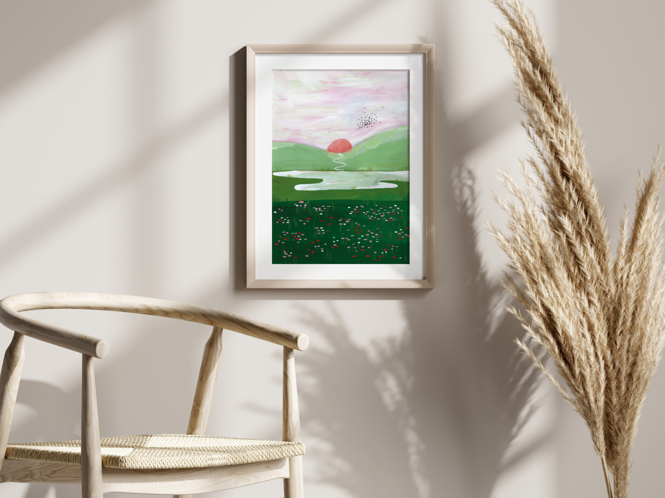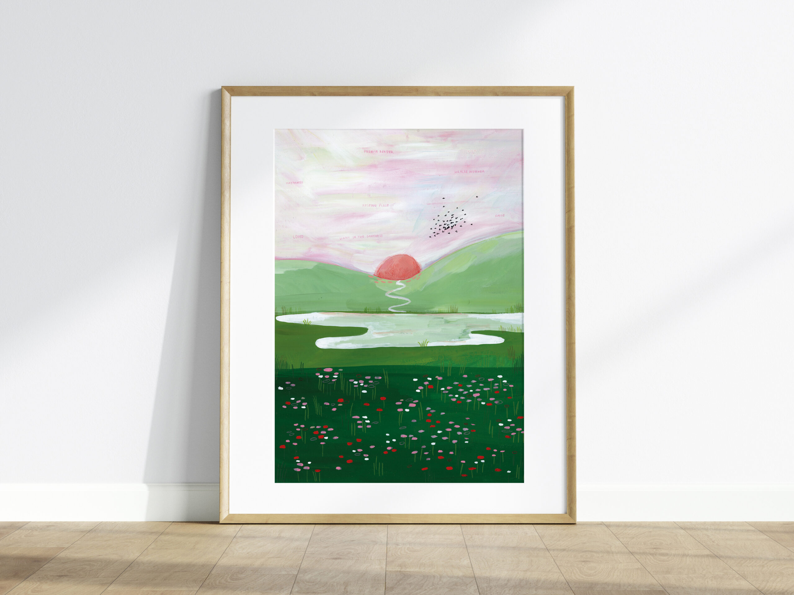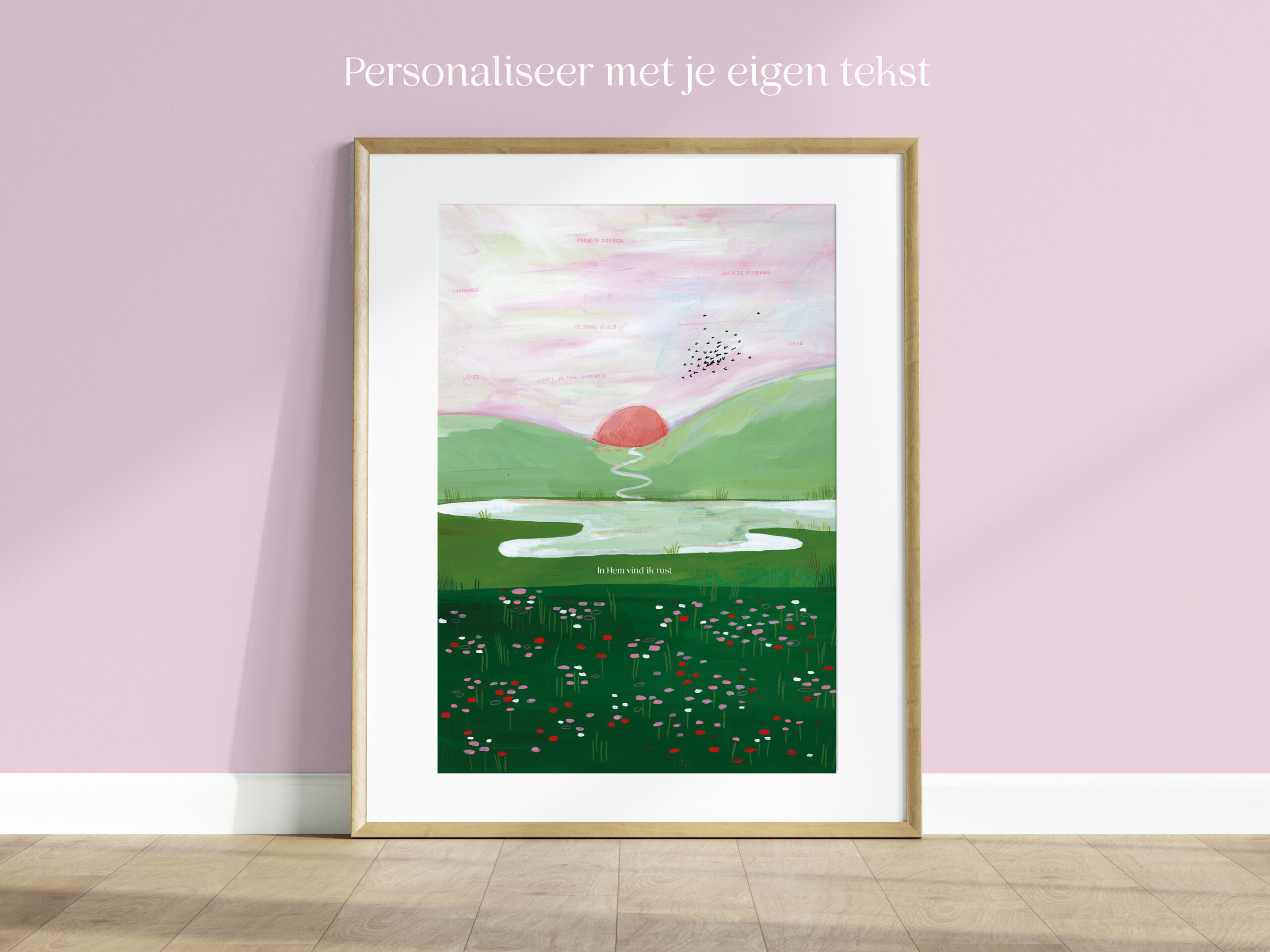 Schilderij van een ondergaande zon in een groen landschap. De print is gemaakt naar aanleiding van een christelijk lied – in de lucht staan woorden. Ik hoop dat dit schilderij je rust mag geven, je mag bemoedigen. De originele illustratie is handgemaakt met gouache en kleurpotlood.