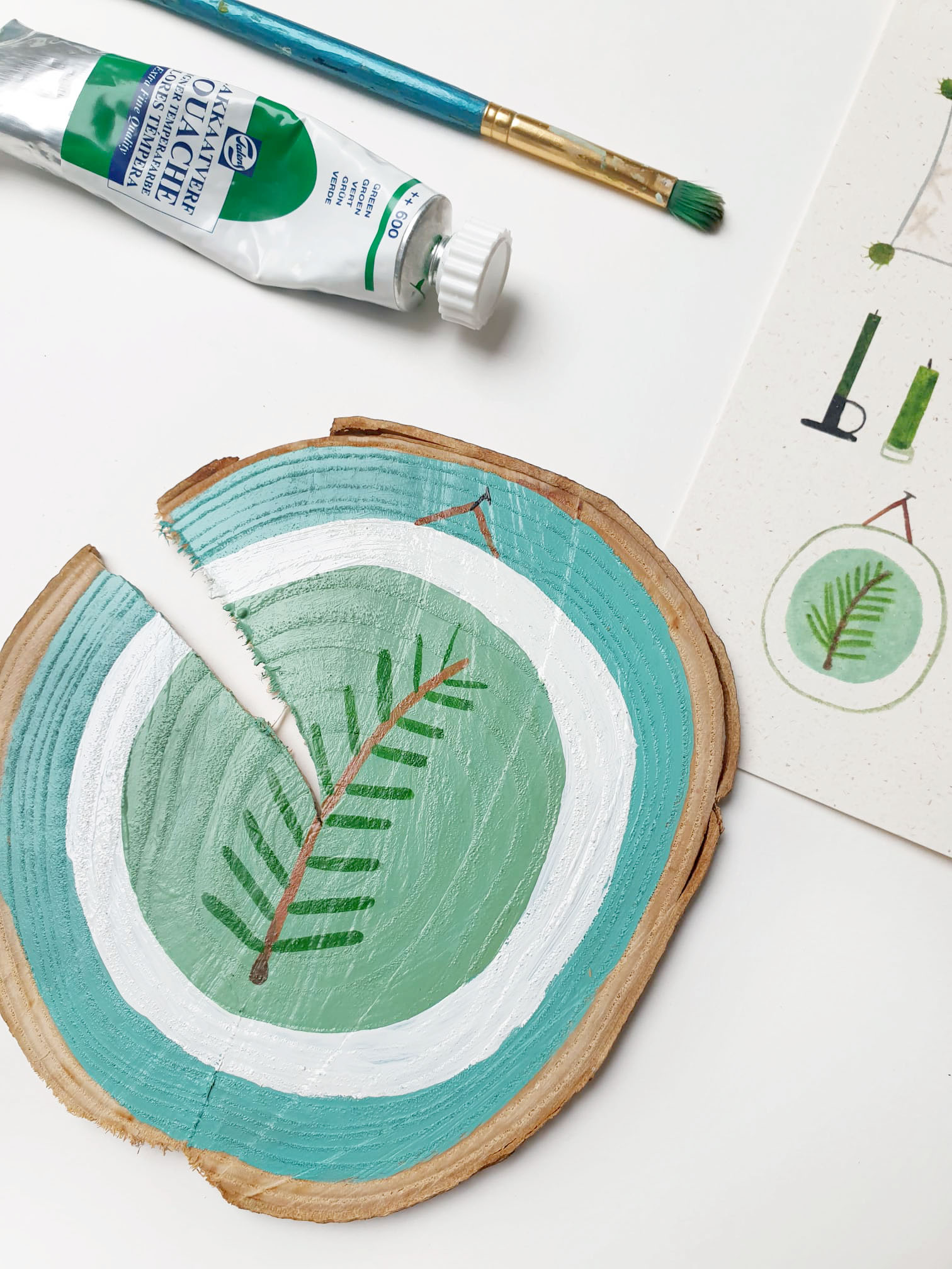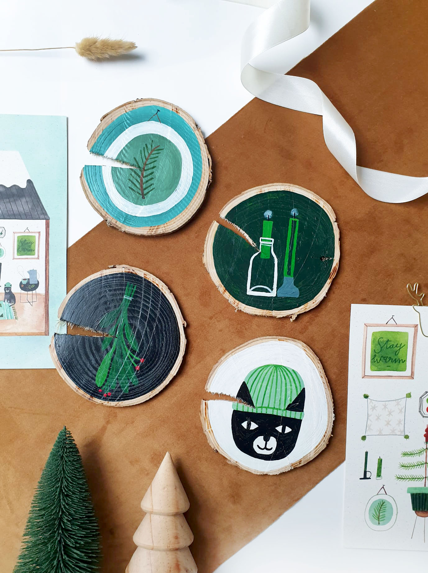 Met de hand geschilderde kerst illustratie op hout. Geschilderd met gouache en daarna geglazuurd met gouachelak. Om je huis gezellig te maken met dennentakken, nu alleen nog die dennengeur…
