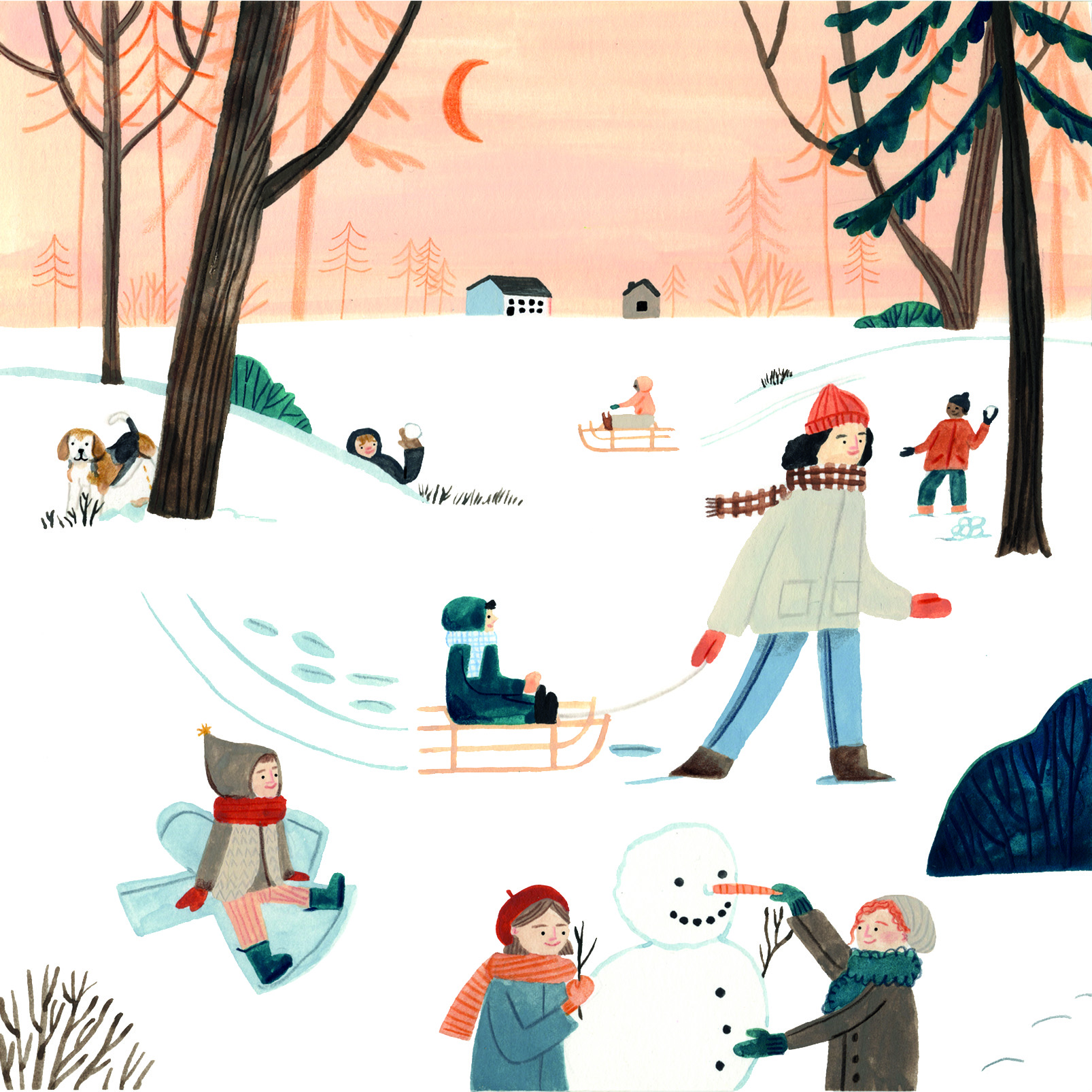 Het is bijna avond. Terwijl de lucht oranje kleurt en de maan door de lege takken heen schijnt, vermaakt iedereen zich nog heerlijk. Er is een sneeuwballen gevecht, we sleeën zo hard als we kunnen en maken meneer Sneeuwpop af. Wat doet die hond nou?